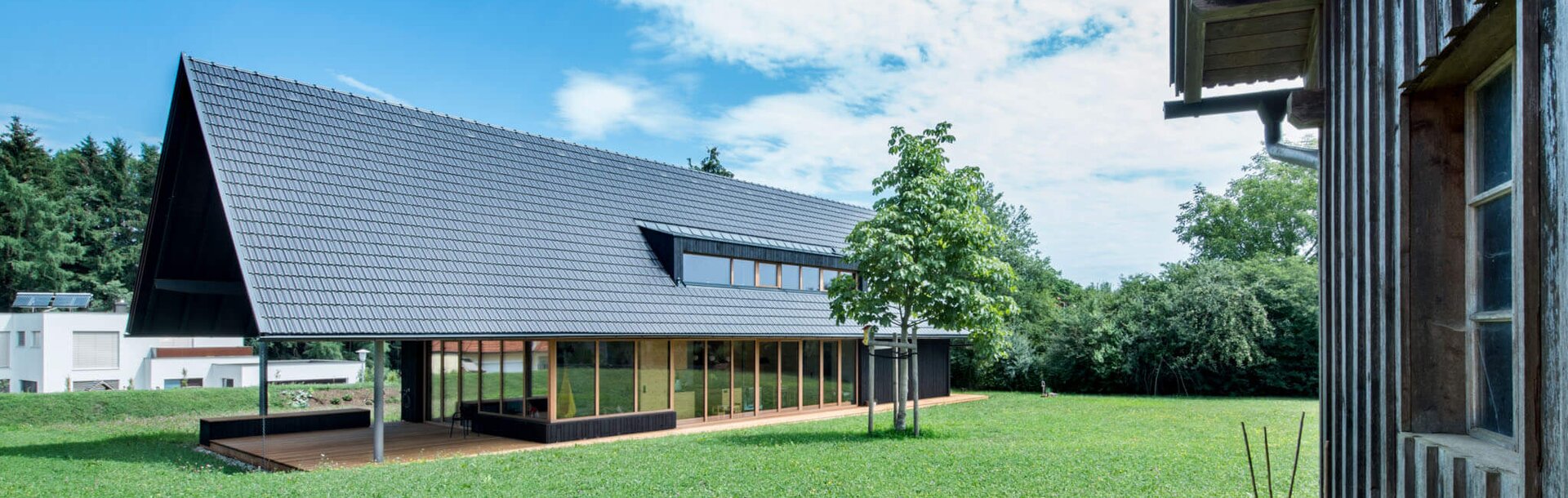 Proprio il tetto è diventato l'elemento di design decisivo: gli architetti Bogenfeld hanno posato un grande tetto a sella su un edificio allungato e luminoso. Il tetto offre ombra, offre spazi aperti protetti dalle intemperie e giace come uno schermo protettivo sulle generose facciate di vetro. Sul lato nord è stata ricavata un'ampia nicchia d'ingresso. I pannelli leggeri a tre strati in legno di larice trattati con l'olio incolore Pullex Holzöl di ADLER conferiscono un aspetto accogliente e invitante. Un altro olio, l'ADLER Aquawood Lärchenöl, è stato utilizzato per le finestre dell'azienda Böhler, che sono state installate dagli esperti di montaggio dell'azienda Palisa e caratterizzano il lato sud e ovest.