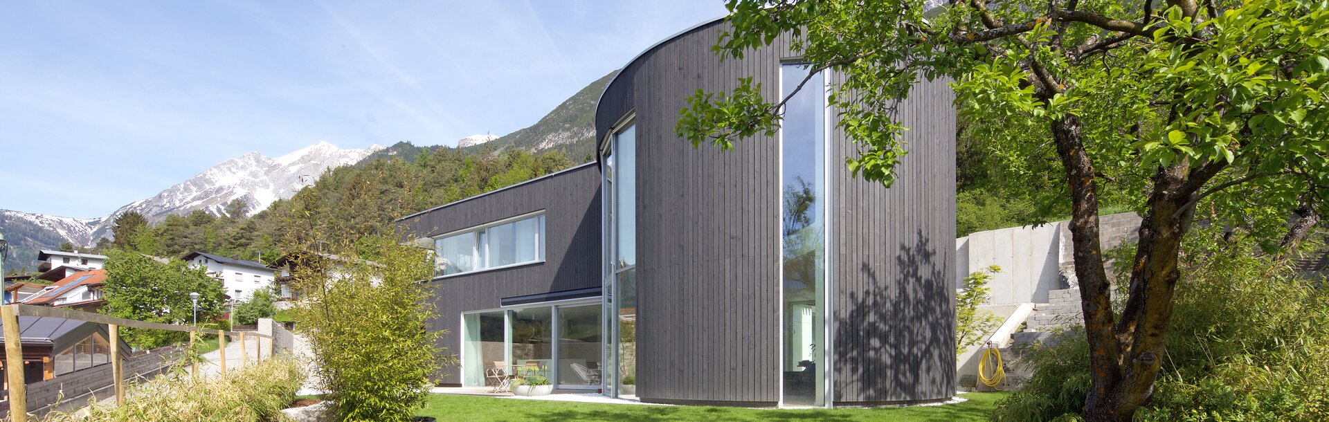 Committente e sviluppatore hanno dato vita ad un elemento centrale a forma di ellisse su due piani, aperto sulla parte superiore: come un padiglione che troneggia nel mezzo del giardino ed unisce le due unità abitative distinte. Due enormi finestre frontali si aprono su di un patio privato contornato da alberi di acero ed uno specchio d'acqua che funge da vasca per gli uccelli. Le altre stanze sono state costruite lungo il ripido pendio seguendo questa volta delle linee rette e spigolose. Questo gioco di linee va a creare un contrasto molto piacevole con la torre rotonda situata nel centro. L'edificio ha preso vita in soli sette mesi ed è costituito da una facciata in abete: il look scuro e nobile è stato ottenuto grazie alla verniciatura con ADLER, precisamente con