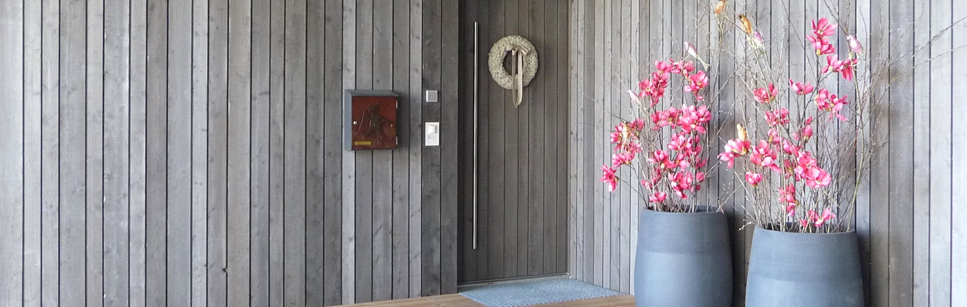 Anche lo sguardo nella direzione opposta - dalla casa alla collina - è coerente. L’edificio è sì moderno, ma strizza l’occhio alle tradizionali costruzioni alpine. La facciata esterna è stata allestita con assi di diverse misure in larice grezzo segato giuntato maschio/femmina con scanalatura a vista. L’ Azienda familiare Holzbau Gläser ha fabbricato le facciate e si è curata anche della loro verniciatura, prima del montaggio. L’effetto finale doveva essere naturale e in stile alpino, ma era necessario assicurare al legno la protezione perfetta contro le più forti intemperie. Il prodotto scelto è la vernice ingrigente ad effetto